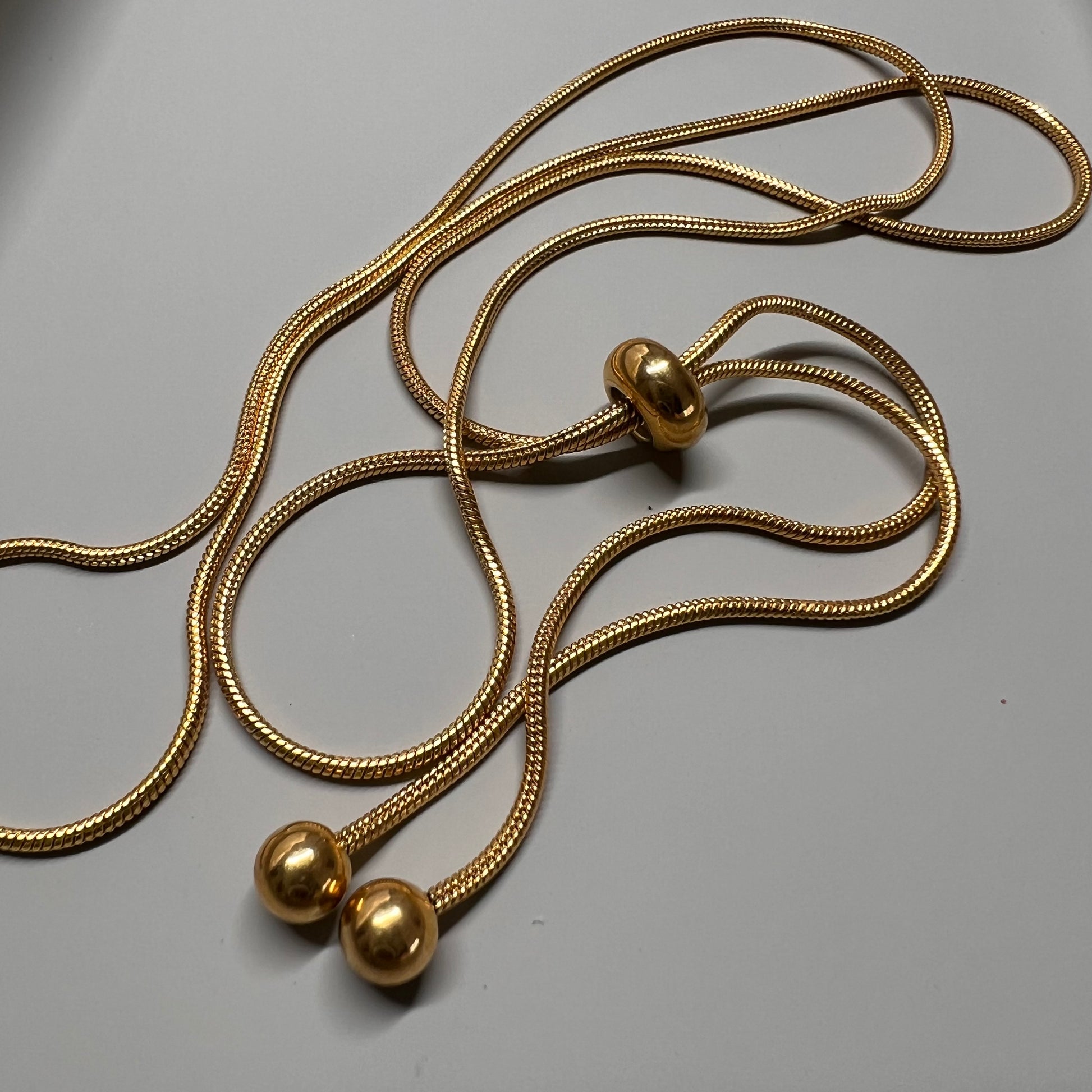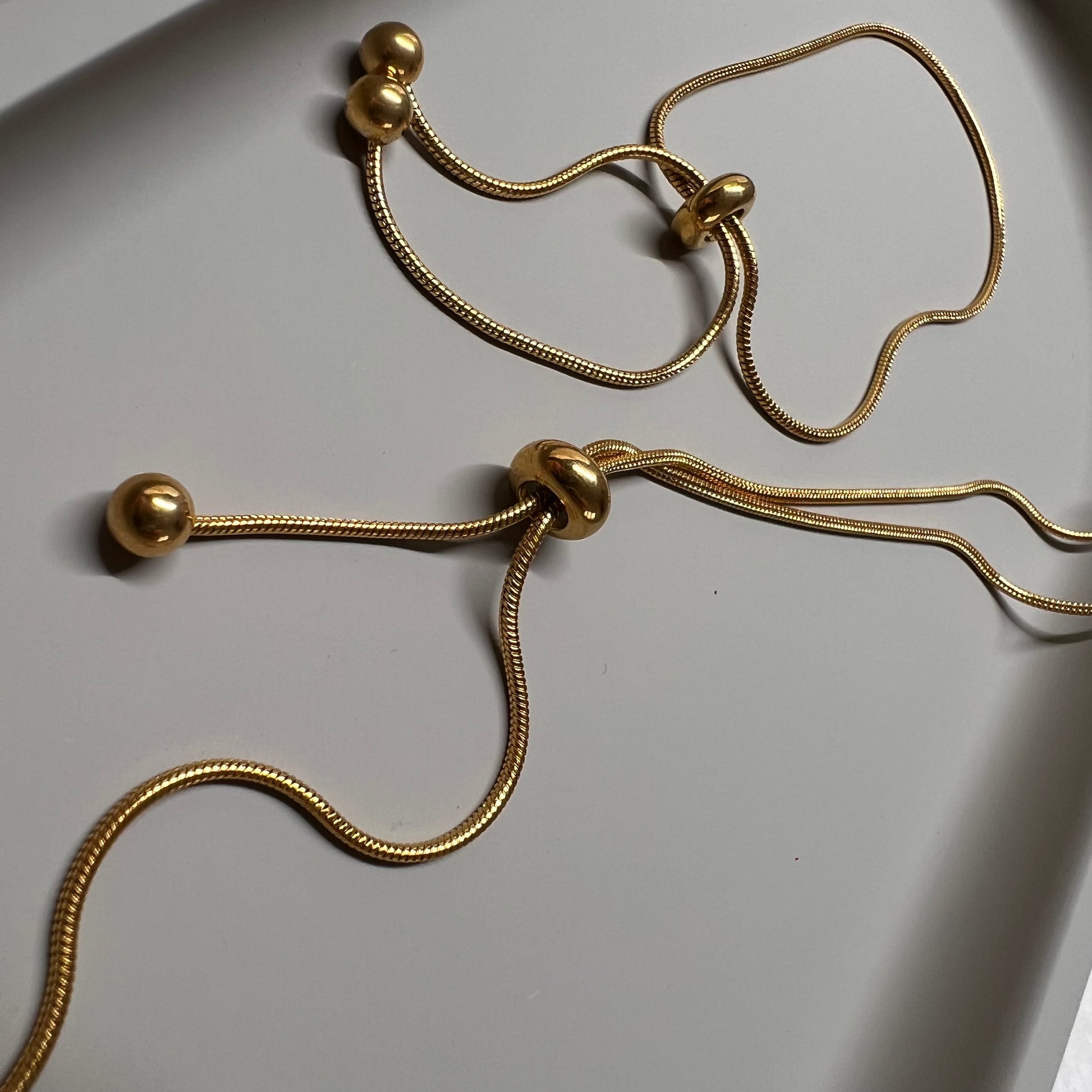 Crafted from durable stainless steel and finished with 18K gold PVD plating, this versatile set includes a necklace (65cm) and bracelet (25cm) that adjust to your perfect fit. With a unique design featuring adjustable strings, you can easily tighten or loosen both pieces to suit your style and comfort.